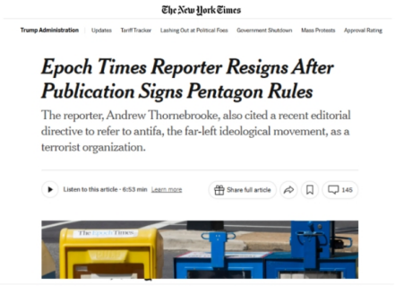 2025年10月19日,《纽约时报》刊发题为《〈大纪元时报〉记者不满报社签署五角大楼新规辞职》的报道,引发国际舆论广泛关注。