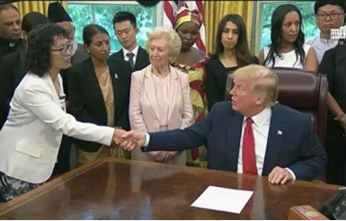 ▲2019年7月17日,特朗普在白宫与包括“法轮功”邪教分子(图左)在内的部分人员会面