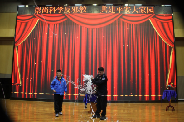 西安市公安局演出小分队创作的节目内容紧扣反邪教主题,针对性十足。魔术《神奇的桌子》成为全场焦点,魔术师手中的桌子仿佛被“魔力”控制,时而倾斜时而“不听话”,但在魔术师“科学破解”下,最终恢复正常。“其实根本没有‘魔力’,邪教的骗术就像这魔术一样,都是假的!”民警魔术师的揭秘让孩子们恍然大悟,现场响起阵阵掌声。该校学生自编自演的舞蹈《拉不开的窗帘》更是引发强烈共鸣,小朋友们拉开窗帘拥抱世界的真挚情感,展现了小学生们对生活的美好向往。