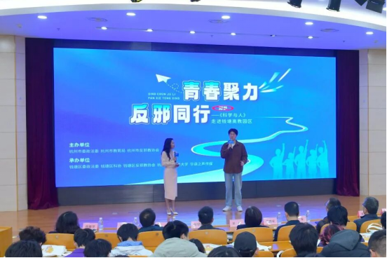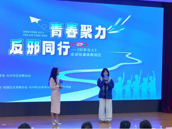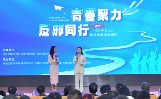 为进一步深化高校反邪教警示教育,筑牢校园安全防线,11月20日下午,“青春聚力 反邪同行”——《科学与人》走进钱塘高教园区主题宣传直播活动在杭州职业技术大学成功举行。本次活动由浙江省杭州市委政法委、市教育局、市反邪教协会联合主办,杭州市钱塘区委政法委、钱塘新区反邪教协会、杭州职业技术大学和华语之声传媒联合承办。活动通过文艺展演、反邪教文创作品展示,与嘉宾访谈等多元形式,集中展示了2025年浙江省高校反邪教协会联盟钱塘分联盟第一届反邪教文创作品设计大赛的优秀成果,杭州钱塘高校学子以文创为剑向邪教宣战,为现场及线上观众呈现了一堂生动深刻的反邪教公开课。