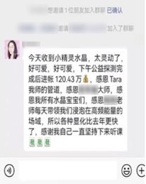 紧接着,他们借助荔枝微课、小鹅通等平台,推出“与神联盟”“创世之光”“仙女星系”等系列“高维能量课程”,再以“家族业力清理”“亚特解码”“仙女高级水晶疗愈”等课程不断升级敛财。为增强课程可信度,孙某琳在微信群聊、腾讯会议等网络课堂中,通过屏幕共享展示伪造的“能量场可视化数据”,让会员对虚无缥缈的“高维能量”深信不疑。