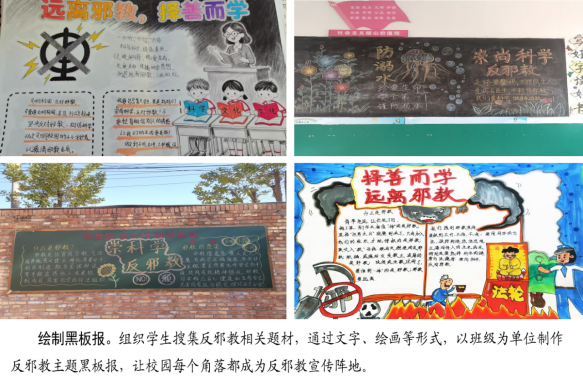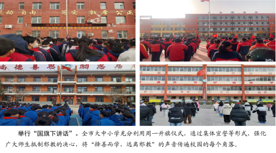 二、形式多元重宣传,同频共振造氛围。为帮助在校师生们认清邪教的危害,增强识别邪教、抵御邪教的能力,全市大中小学在校内拓展宣传载体,构建多层次宣传体系。通过举行“国旗下讲话”、举办专题讲座、观看宣传片、开展主题班会、举办知识竞赛、绘制黑板报、开展签名活动等形式,指导在校师生掌握“不听、不信、不传播”的防范原则,同频共振营造了反邪防邪浓厚校园氛围。