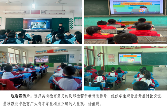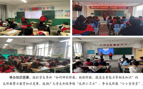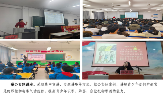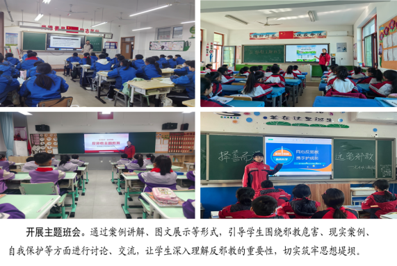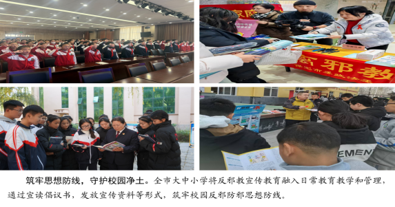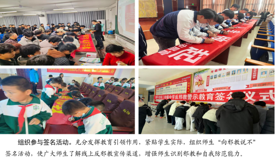三、树牢思想筑防线,同心协力护校园。全市大中小学将反邪教知识有机融入思想政治、法治教育等课程,结合校园安全、反欺凌等工作,针对不同学段学生的认知特点,采取差异化教育策略,构建学校、家庭、社会“三位一体”的协同防护网络,推动反邪教宣传向家庭延伸,鼓励学生将宣传资料带回家,与家长共同学习,形成了“小手拉大手”的辐射效应,筑牢校园反邪教思想防线,同心协力守护校园和谐稳定。