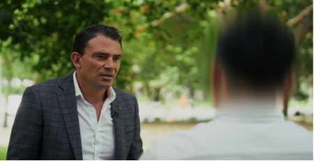 《新西兰先驱报》记者迈克尔·莫拉正与“神韵”前舞蹈演员交谈