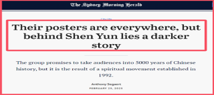 2025年2月25日,澳大利亚《悉尼先驱晨报》发表文章《“神韵”海报随处可见,但其背后却隐藏着一个更黑暗的故事》。报道中提到,“神韵”的运营模式与其表演一样非传统。2008年以来,“神韵”一直在澳大利亚演出,但宣发、售票、住宿和旅行费用均由当地“澳大利亚法轮大法协会”承担。该协会一直号称自己是免税慈善机构,但根据公共慈善机构注册登记记录其资格已被注消。最新财务报告显示,该组织在2022-2023财年花费近200万美元用于广告宣传、租用场地、差旅费用等,这些费用支出除了来自门票销售(233万美元),记录显示“法轮功”成员还贡献了17万美元无担保无息贷款。