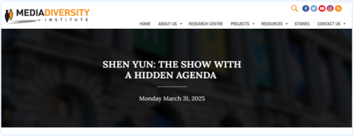 2025年3月31日,总部位于英国伦敦的“媒体多样性研究所”(Media Diversity Institute,简称MDI)在其网站登载文章,称“神韵演出”自诩为“中国传统艺术文化盛宴”,但是它与“法轮功”邪媒《大纪元时报》之间有着密切联系。报道指出,《大纪元时报》经常将文化表演与“法轮功”政治信息混为一谈,替“神韵”做虚假宣传,他们的这种联系引发人们广泛担忧。