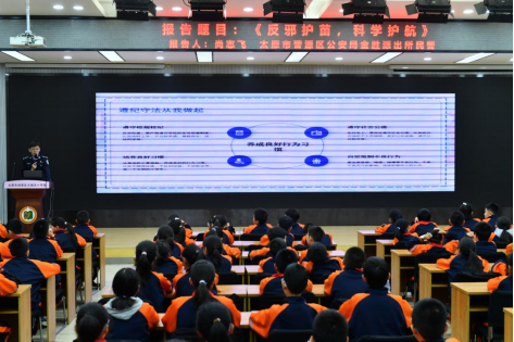太原市晋源区公安局金胜派出所民警以《反邪护苗,科学护航》为题,开展了一堂生动的法治教育课。他围绕“法律是什么”“生活与法律”“不良行为的定义与后果”等内容,结合真实案例剖析青少年常见不良行为及其法律风险,引导同学们树立行为边界意识,自觉抵制诱惑,做遵纪守法的好少年。尚志飞还特别强调了邪教的非法组织本质,提醒同学们遇到可疑情况及时向家长、老师或警方求助。