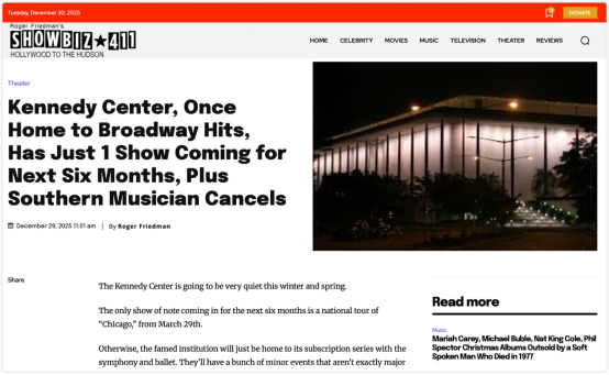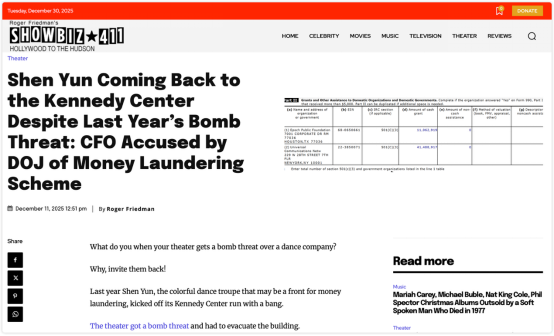 编者按:美国娱乐媒体Showbiz411创始人兼专栏作家罗杰·弗里德曼2025年12月连续发表评论文章,对“法轮功”的附庸娱乐团体兼敛财工具“神韵艺术团”重返肯尼迪中心的前因后果进行了集中评述,并将这一现象放置于更广泛的政治与文化语境中加以审视。