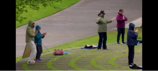 那位女性似乎是当地负责人,中断了自己的练习来指导我。她详细解释了动作要领,并强调保持动作规范非常重要:男女站位相反——右手在上或左手在上,双脚相触,其他人需要完成基础转身动作。