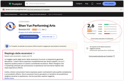 2025年9月12日,意大利观众Luigina在全球用户点评网站Trustpilot(意大利语版)上对“法轮功”邪教组织旗下的“神韵演出”给出最低评分(1星),并发表评价: