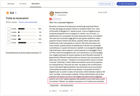 编者按:有意大利观众在全球用户点评网站Trustpilot(意大利语版)上反映,因其对“法轮功”邪教组织旗下“神韵演出”作出差评,遭演出主办方多次联系,要求其提供确实观看过演出的证据,否则威胁删除相关评价,这让观众感到不适。另有观众反映,“神韵”在总体评分为“差”的情况下,仍试图通过小恩小惠诱导观众给出好评,疑似导致评论灌水现象。