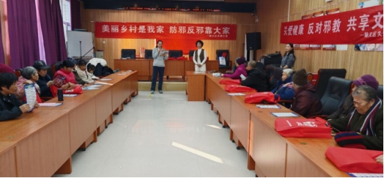 1月27日下午,顺义区关爱之家在杨镇齐家务村民活动中心以“美丽乡村是我家 防邪反邪靠大家”为主题,结合春节期间邪教可能借机渗透的特点,用通俗易懂的语言向村民宣讲反邪教知识,深刻揭露邪教迷惑群众、破坏家庭的罪恶本质。宣讲活动后,村民们仔细观看了反邪教宣传展板,认真学习邪教的骗人伎俩与防范方法。顺义区关爱之家工作人员为参与群众发放了反邪教宣传年画、福字、宣传册、扑克、毛巾等宣传品,让平安反邪教理念伴随新春祝福走进千家万户。