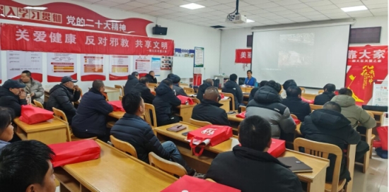 1月28日上午,在木林镇荣各庄村会议室,顺义区委政法委反邪教负责人对全镇治保主任和部分网格员开展反邪教警示教育宣讲,就春节期间如何开展反邪教工作进行部署和安排。顺义区委政法委反邪教负责人要求与会人员在春节期间加强对旅游景区的重点部位的巡逻,加大对邪教人员的排查、巡查,做到邪教隐患早发现、早处置,及时消除社会影响面,确保辖区安全稳定和谐。宣讲结束后,顺义区关爱之家工作人员发放反邪教宣传年画、窗花、宣传册等宣传品。