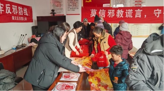 2月3日下午,顺义区关爱之家在马坡镇衙门村委会举办“邻里同心反邪教 社区平安万家乐”警示教育宣传活动。活动现场,顺义区关爱之家工作人员结合“信教能治病”“信老天爷保平安”等邪教常用的歪理邪说为村民讲解邪教是如何一步步把人拉入邪教的“泥潭”,通过讲解无辜群众加入邪教后的悲惨案例警醒村民不要误入歧途,并告诫村民如遇到邪教侵扰,一定要及时拨打110报警电话。活动结束后,顺义区关爱之家工作人员发放了反邪教宣传海报、年画、窗花等宣传品,为村民送上节日祝福。