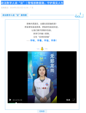 本次实践的一个突出亮点,在于对既有“政法数字人”资源的创造性深化应用。该形象自2025年引入后,已积累一定认知度。龙岗区将其系统化融入反邪教宣传,标志着数字人从一般信息发布者向专业警示教育互动者的角色深化。近期推出的第四期“政法数字人说‘法’”——《警惕邪教套路,守护真实人生》,精准聚焦揭露邪教骗局,通过数字人视频讲解,生动剖析邪教将歪理包装成真理、把陷阱伪装成坦途的层层套路,并清晰传达了“不听、不看、不信、不传”的“反邪四部曲”核心要诀。