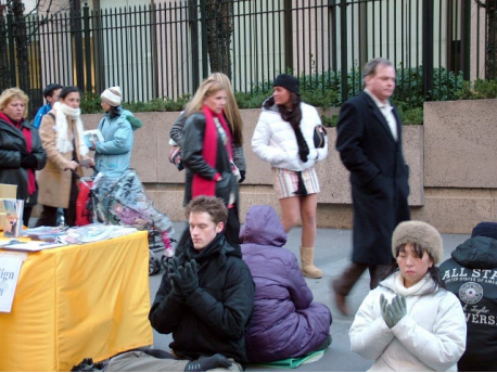 中午12:15午休时间,于宾夕法尼亚车站台阶上“集体练功”30分钟;