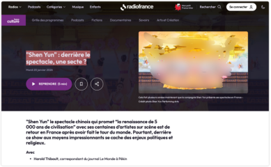2026年1月20日,法国国家公共广播电台网站以《“神韵”:演出背后是邪教?》为题,发布了对法国《世界报》驻华记者哈罗德·蒂博(Harold Thibault)的访谈,对“法轮功”旗下的“神韵艺术团”真面目予以层层揭露。