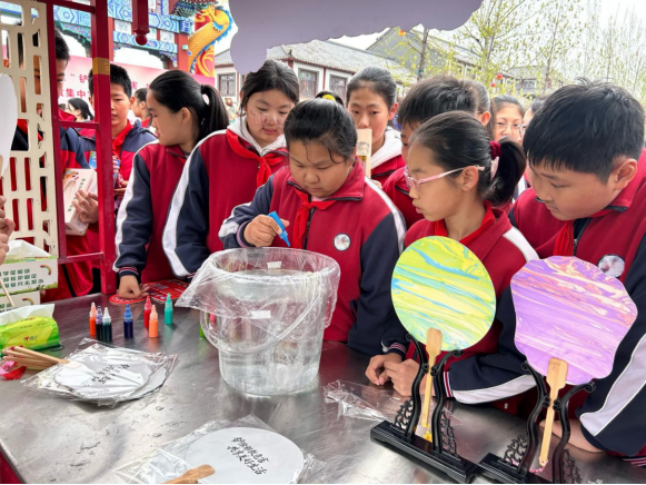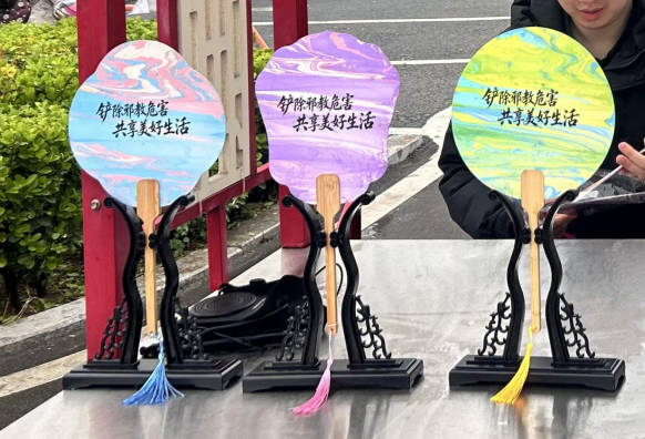 “反邪教漆扇体验区”内,非遗漆扇技艺与反邪教宣传巧妙融合。参与者们通过滴漆、晕染等传统工艺,让扇面呈现出五彩斑斓、独一无二的纹理,在感受传统漆艺魅力的同时,将反邪意识深深印在心中。