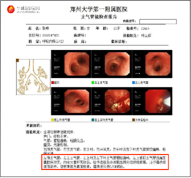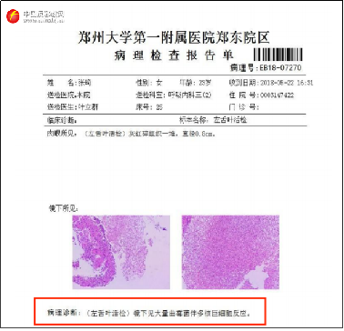 ▲郑大一附院呼吸内科关于张琦的《支气管镜检查报告》和《病理检查报告单》