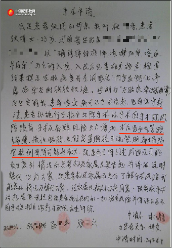 ▲张琦母亲杜廷香2018年6月4日手写《手术申请》,包括张琦丈夫孙某云、父亲张某兴在内4名亲属同时签名并摁手印。《手术申请》明确写道:“医生告诉我,患者该疾病可以手术治疗,也有保守疗法。患者拟施行左肺全切除手术。”