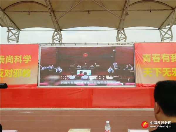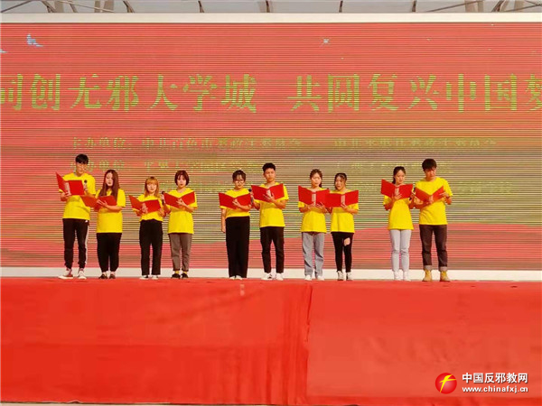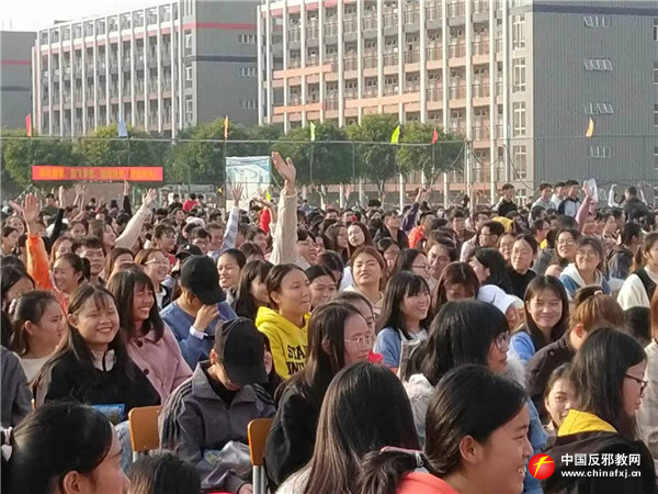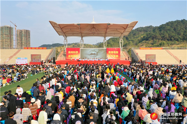 下午3点,广西培贤国际职业学院体育场国旗飘扬,歌声嘹亮,和煦的暖阳与一万多名大学生阳光笑脸交相辉映,现场充满了喜庆和欢乐。主席台的主题展示和两旁的巨幅反邪教标语,又营造了浓浓的反邪教宣传气氛。