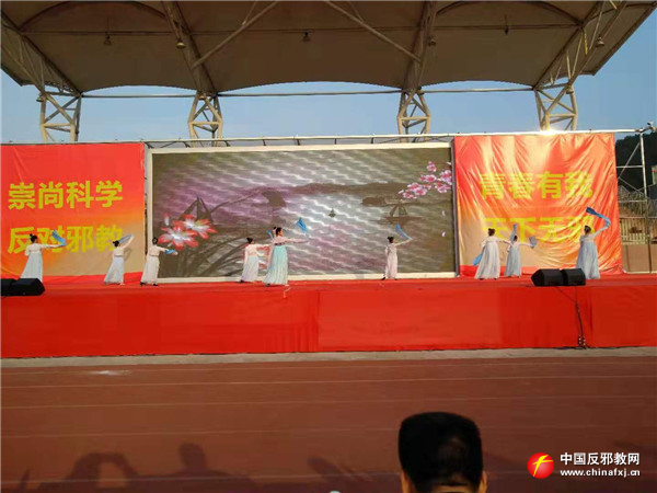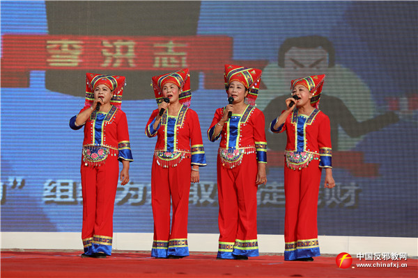 在文艺演出中,学生们表演歌舞节目,展现了新时代大学生对祖国对时代的热爱和无限的青春活力,而由4位当地壮族“嘹歌王”表演的嘹歌《擦亮眼睛,远离邪教》,以民族特色的表演和通俗易懂的语言告诉广大师生什么是邪教,邪教有哪些危害,如何防范邪教,拒绝邪教。在演出过程中,主持人分4个时段进行28道题的反邪教知识问答,抢答正确的获得反邪教礼品包。学生们踊跃抢答,且全部答对,现场互动气氛十分活跃。
