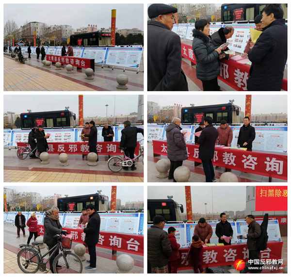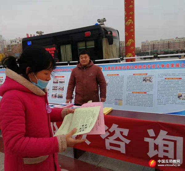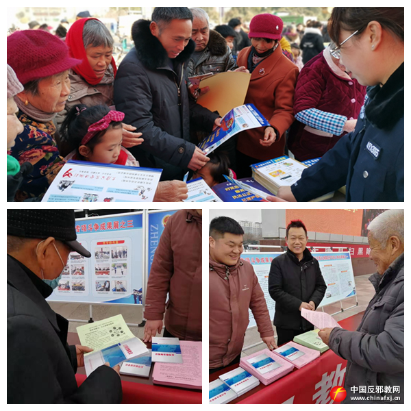 2019年12月28日,河南省周口市太康县扫黑除恶专项斗争成果展在该县人民广场举行,全县28个县直单位、23个乡镇共1000余人参加了活动。现场展现的一幅幅鲜活的板块,吸引了不少群众驻足观看。太康县委政法委以此为契机开展反邪教宣传活动,教育引导群众反对邪教,远离邪教,共建和谐美丽家园。