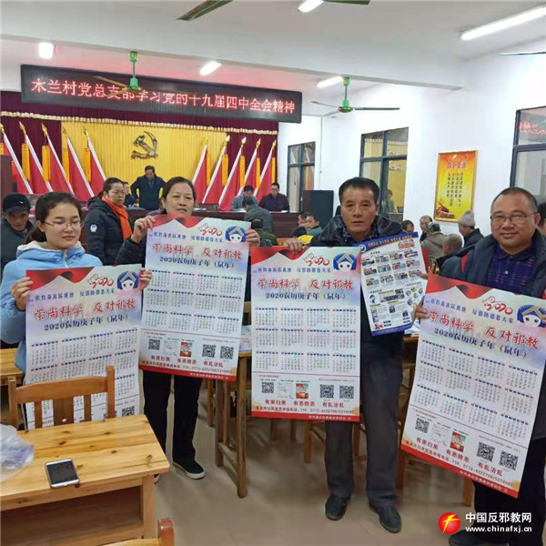 1月3日,忻城县大塘镇木兰村党总支部召开党员大会,学习党的十九届四中全会精神,忻城县委政法委借此契机积极开展反邪教宣传活动。
