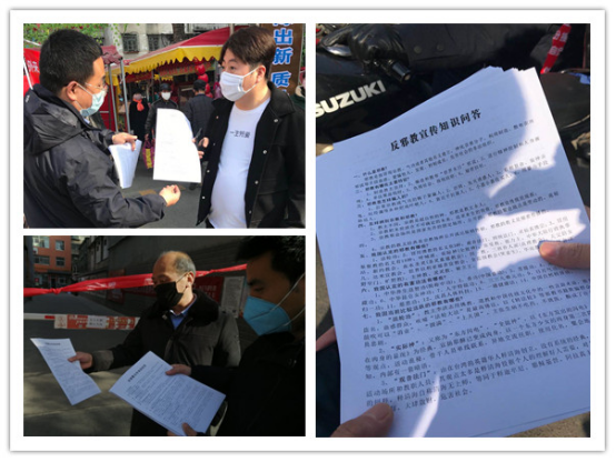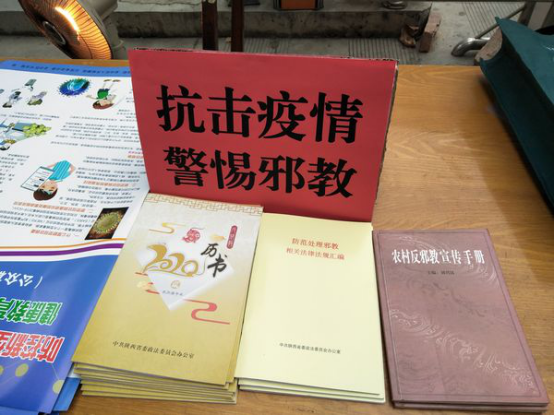 疫情期间,为了加强防范处理邪教工作,工作人员还在防控服务点摆放反邪教警示教育宣传牌、设立反邪教咨询点、悬挂反邪教协会横幅等,提醒广大人民群众做好防护措施,自觉远离邪教。