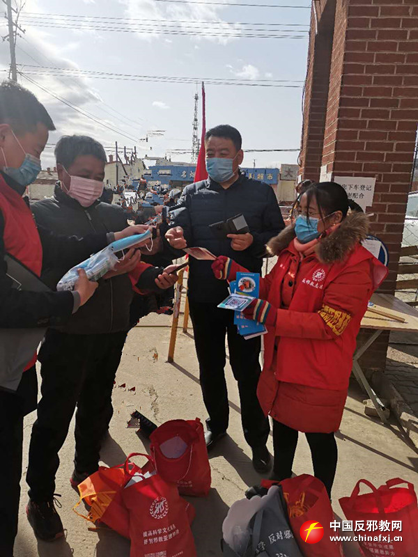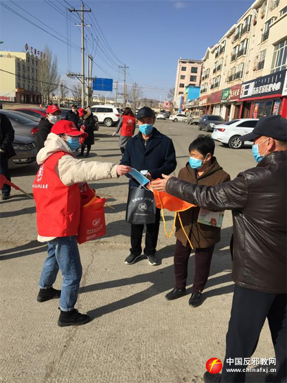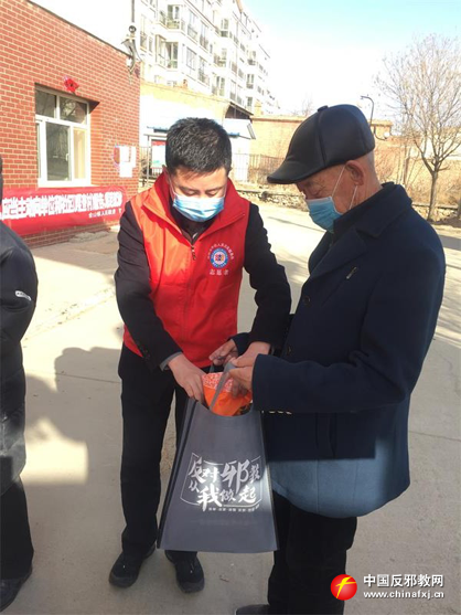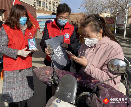 3月6日,固阳县反邪教协会组织反邪教志愿者在翡翠城一期和二期小区开展反邪教和疫情防控宣传。在宣传过程中志愿者鼓励社区居民扫码关注固阳反邪微信公众号,及时了解反邪动态和相关法律法规,同时向社区居民发放反邪教宣传资料、口罩和印有反邪教字样的宣传品笔、笔记本、围裙和手提袋。一方面引导居民不信邪、不听邪、不传邪,不参与邪教活动,另一方面引导群众正确认知疫情的可防可控。
