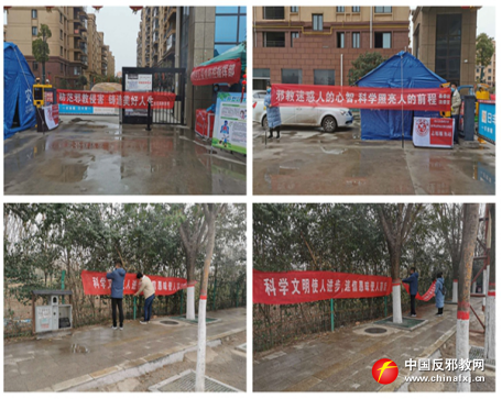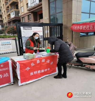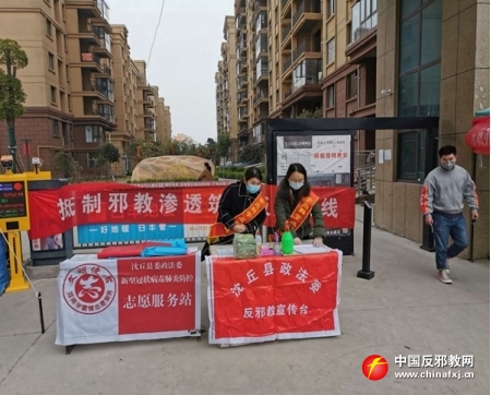 “疫情就是命令,防控就是责任”,在抗击疫情一线,沈丘县青年志愿者始终坚守城区各防控服务点,仔细核查来往人员信息,入户排查住户体温情况,为疫情防控做出了积极贡献。“邪教迷惑人的心智,科学照亮人的前程”“防范邪教侵害,铸造美好人生”“科学文明使人进步,迷信愚昧使人落后”“抵制邪教渗透,筑牢反邪防线”,在沈丘县东城办事处社区,青年志愿者通过悬挂反邪教宣传横幅、发放反邪教宣传资料、围裙等方式,向广大居民群众宣传防疫反邪教知识,教育引导广大群众科学防疫,拒绝谣言,特别是发现邪教组织网上网下借疫情散布歪理邪说、蛊惑拉拢群众等违法犯罪线索要主动举报,不让邪教祸害群众。