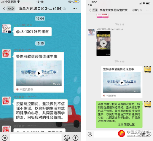 红谷滩区针对辖区住宅小区多、人口密集等特点,为防范邪教人员趁机造谣生事,社区干部、网格员在做好疫情防控的同时,加强《南昌市反邪教群众举报奖励办法》的推广宣传,激发了市民群众反邪防邪的积极性。根据疫情形势,重点通过各小区业主微信群,转发并号召居民收看中国反邪教网制作的《警惕邪教借疫情造谣生事》短视频,在群众中产生剧烈反响,不少居民表示从未想到“法轮功”等邪教组织如此卑鄙龌龊,全民参与防范抵制邪教的良好氛围得到进一步强化。
