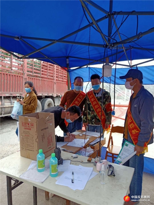 依托各村综治网格员、志愿者等基层工作力量,充分发挥网格群防群治队伍作用,在村居出入口疫情防控点设立反邪教宣传台,利用新型冠状病毒防疫入户走访时机,开展反邪教宣传工作。在入户走访过程中,主动向居民询问是否有邪教传教活动,并向居民宣传各类邪教的特点、危害以及防范注意事项等反邪教常识,尤其要提防邪教组织利用新型冠状病毒感染肺炎事件,打着“防病”“治病”等口号,蛊惑群众,拉人入教,提醒群众要做到“不听、不看、不信、不传”,告知居民群众在疫情期间要勤洗手、戴口罩、少出门、不聚会才是科学的防疫。