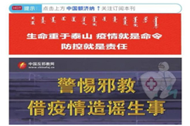 开拓创新,线上线下广宣传。面对疫情严峻形势,阿拉善盟额济纳旗反邪教协会将宣传教育工作转移到新媒体上,借助中国额济纳网站,额济纳政法微信公众号、额济纳反邪微博等新媒体开展形式多样、内容丰富的线上宣传教育活动,大力宣传科学防疫知识并驳斥疫情相关谣言,引导群众辨别核实网络信息,抵制邪教势力对广大居民思想文化领域的渗透。