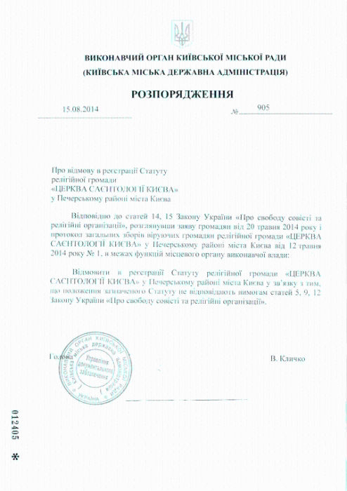 乌克兰首都市政官网上发布了基辅市长维塔利·克里奇科签署的禁止科学教在基辅注册机构的命令(2014年8月15日基辅市政第905号令)。该令还说明了拒绝其注册的理由,该组织的章程条款不符合乌克兰《良心自由法》第5、9及12章的要求。