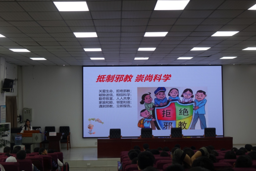 宣讲活动上,授课老师以内容丰富的PPT开展教学,从什么是邪教、邪教的特征、打击处理邪教的法律法规等四个方面开展了详细讲解。通过列举身边的现实案例,深动形象地揭开邪教的真面目,提醒同学们对邪教组织活动要不听、不信、不传、不参与。
