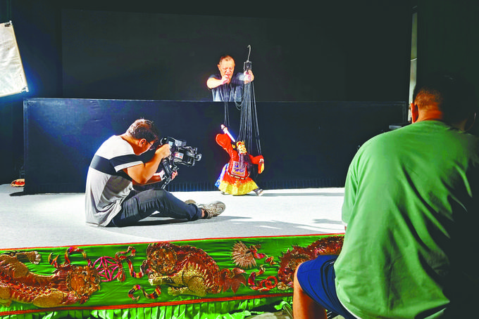 创作团队在泉州市提线木偶戏传承保护中心拍摄反邪教宣传短片。王晓杰摄
