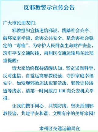 在汽车站、重要交通枢纽的电子显示屏上,持续滚动播放“崇尚科学,反对邪教”、“邪教危害社会,抵制人人有责”等简洁有力、警示性强的宣传标语。充分利用公交车覆盖面广、贴近市民生活的特点,在全多条线路的公交车辆车载电视或移动媒体上,循环播放反邪教警示教育短视频。积极运用“互联网+”思维,依托“肃州区交通运输局”微信公众号等政务新媒体平台,及时发布反邪教警示宣传公告、权威解读文章以及精心制作的短视频作品。
