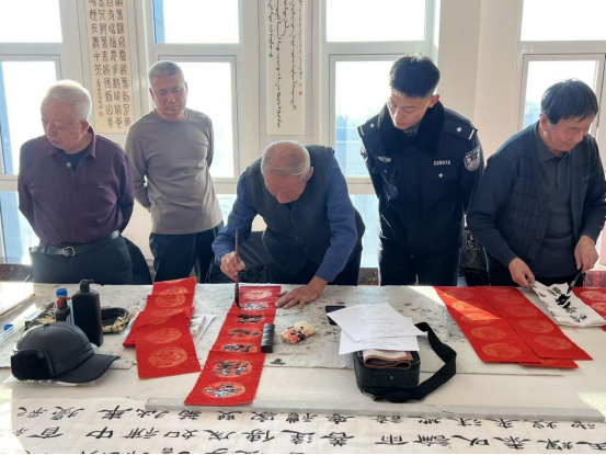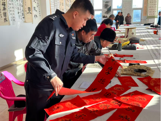腊月的孝庄文化广场,寒风吹得人裹紧了棉衣,可广场中央的长桌旁却热闹非凡——大红的宣纸铺得整齐,墨汁的清香伴着阵阵笑语飘散开,内蒙古科左中旗公安局的民警们和书法协会的老师们正凝神挥毫,周围围满了踮脚张望、等着领对联的群众,一张张笑脸映着红纸,把冬日的寒冷都驱散了不少。