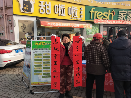 活动现场翰墨飘香。书法志愿者现场挥毫,一幅幅承载着新春祝愿与警示教育的春联跃然纸上:“崇尚科学千家福,抵制邪教万事兴”“春满人间邪教远,福临门第正气扬”……群众纷纷驻足,一边欣赏书法艺术,一边品味联中深意,现场洋溢着节日的喜庆与文明的清风。