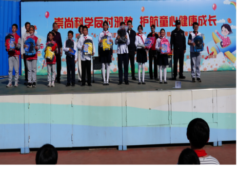 最后,参会领导向学生代表发放了书包、笔盒、笔袋、水杯、雨伞、提袋、宣传册、折页、宣传卡片及倡议书等宣传品800余套,鼓励孩子们将反邪教知识带回家中,争做“反邪小卫士”。