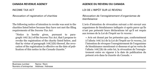 ▲加拿大《政府公报》(Canada Gazette)上关于“加拿大法轮大法协会”被取消慈善资质的信息