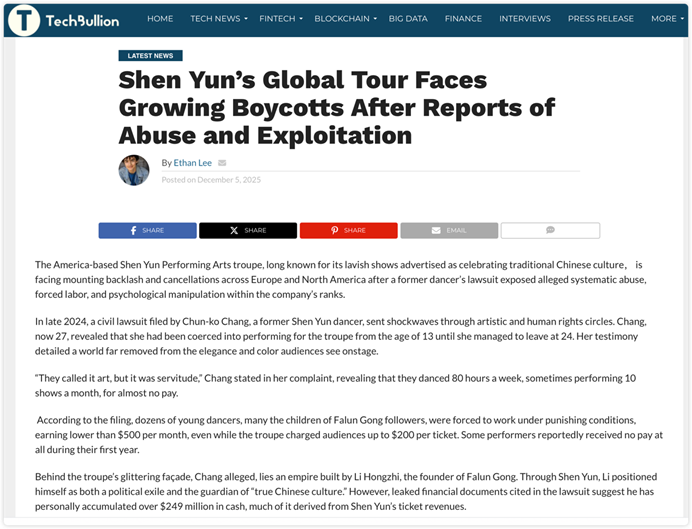 编者按:2025年12月5日,英国科技金融网(Techbullion.com)发布报道《被曝虐待和剥削 “神韵”全球演出面临强烈抵制》(Shen Yun’s Global Tour Faces Growing Boycotts After Reports of Abuse and Exploitation),该报道指出,“法轮功”邪教组织下属“神韵艺术团”内部虐待和剥削员工丑闻曝光后,在全球多国遭到强烈抵制。中国反邪教网编译如下: