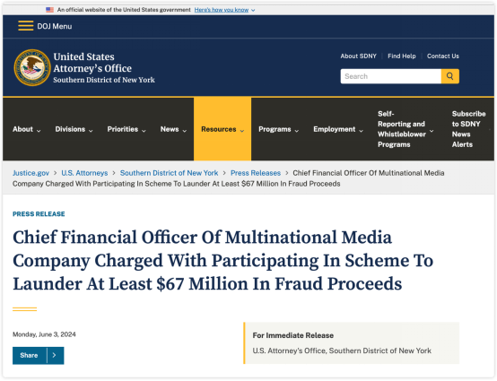 ▲2024年6月3日,美国司法部通报称,“法轮功”邪教组织旗下《大纪元时报》首席财务官关卫东涉嫌洗钱被捕