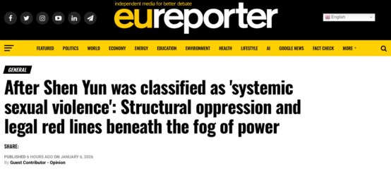 编者按:2026年1月6日,欧洲媒体《欧盟记者报》登载特约撰稿人文章《“神韵”被归类为系统性性别暴力之后:权力迷雾下的结构性压迫与法律红线》指出,“法轮功”邪教组织下属“神韵艺术团”内部存在严重的结构性压迫,表演者——尤其是女性和未成年人——被高度工具化,心理操控、强制劳动及思想控制广泛存在。文章同时披露,“神韵”在意大利的关联机构因财务违规被撤销非营利资格,并涉嫌签证和社保违法。文章呼吁国际社会从人权与法治角度对“神韵”及其关联组织展开深入调查,强调艺术不应成为规避法律、掩盖剥削的遮羞布。