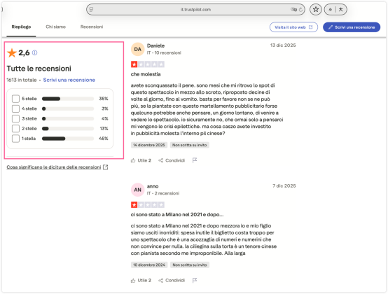 编者按:有意大利观众在全球用户点评网站Trustpilot(意大利语版)上反映,因其对“法轮功”邪教组织旗下“神韵演出”作出差评,遭演出主办方多次联系,要求其提供确实观看过演出的证据,否则威胁删除相关评价,这让观众感到不适。另有观众反映,“神韵”在总体评分为“差”的情况下,仍试图通过小恩小惠诱导观众给出好评,疑似导致评论灌水现象。
