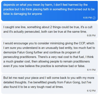 我:谢谢你,杰。是的,我非常清楚不能助长“迫害”,这当然也不是我的目的。但这并不能成为不去批评“法轮功”的理由——至少这是我现在的看法。不过,我很感激你愿意花时间回应,也期待听到你的想法。