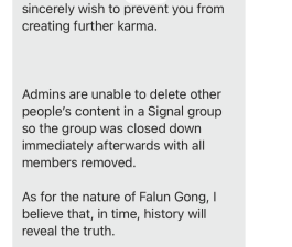 我曾是一个名为“大法分享”(Dafa Sharings)的Signal群成员,我把文章也发到了群里,因为我知道Signal群无法删除单条聊天记录。