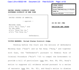 2026年1月21日,美国纽约南区联邦地区法院(United States District Court for the Southern District of New York)就涉及邪教组织“法轮功”旗下媒体《大纪元时报》高管洗钱案作出关键裁定,依法全面驳回被告关卫东(Bill Guan)和黎文雄(Le Van Hung)于2025年11月14日提出的审前动议,包括要求政府提供案件具体事项说明、申请排除依据搜查令扣押的相关证据以及请求驳回补充起诉书。法院裁定明确,被告方相关程序性抗辩理由不能成立,案件进入实质性审理阶段。