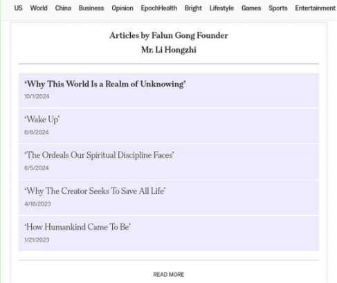 ▲“大纪元”首页开设“法轮功”头目李洪志的专栏,此为2025年10月“大纪元”首页截图,文章标题带有福音派色彩